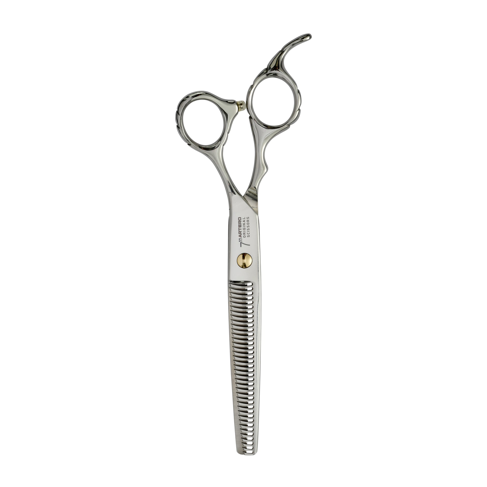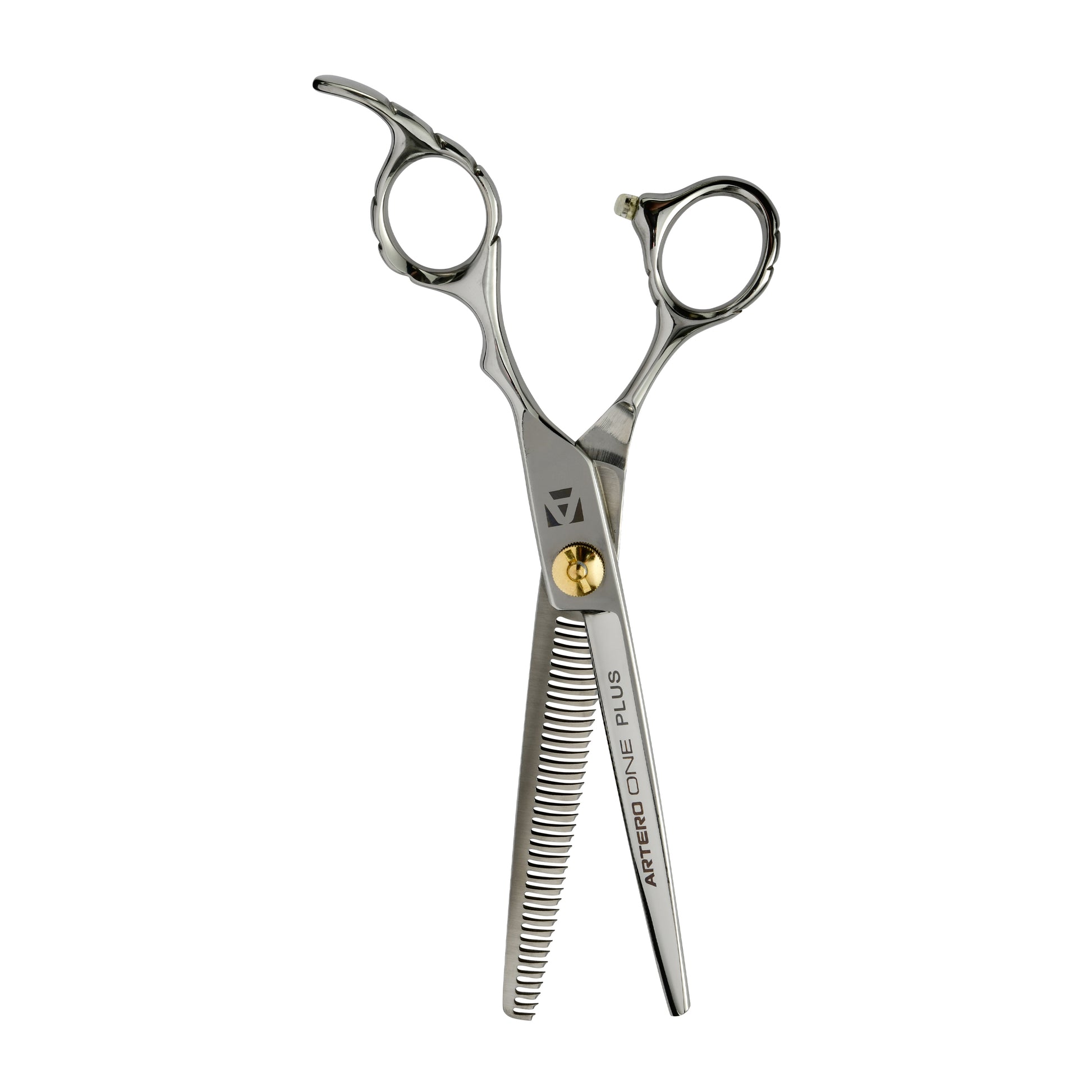 Professionele schaar. Dankzij het hoge uitdunningsvermogen kan het in korte tijd een grote hoeveelheid haar verwijderen. Met een verstelbare schroef voor eenvoudige aanpassing van de spanning.